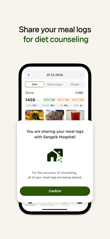 - Após a conexão, seus registros de refeições salvos no aplicativo serão automaticamente compartilhados com seus nutricionistas, médicos ou treinadores.