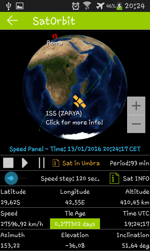 Posição em tempo real da Estação Espacial Internacional, também incluindo outros 1450 satélites, on-line e off-line, depois de baixar dados de órbita (ELT).