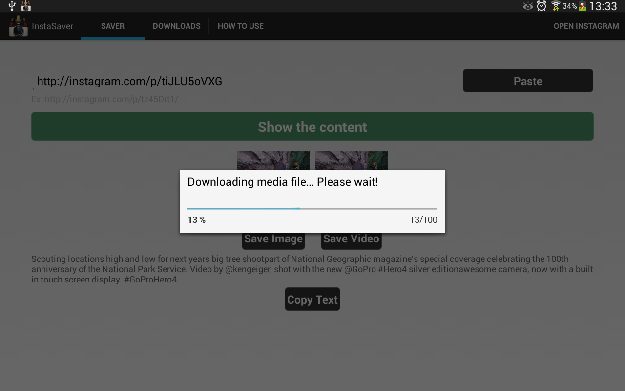 Copia a descrição, Hashtags, Transfere imagens e vídeos de instagram.