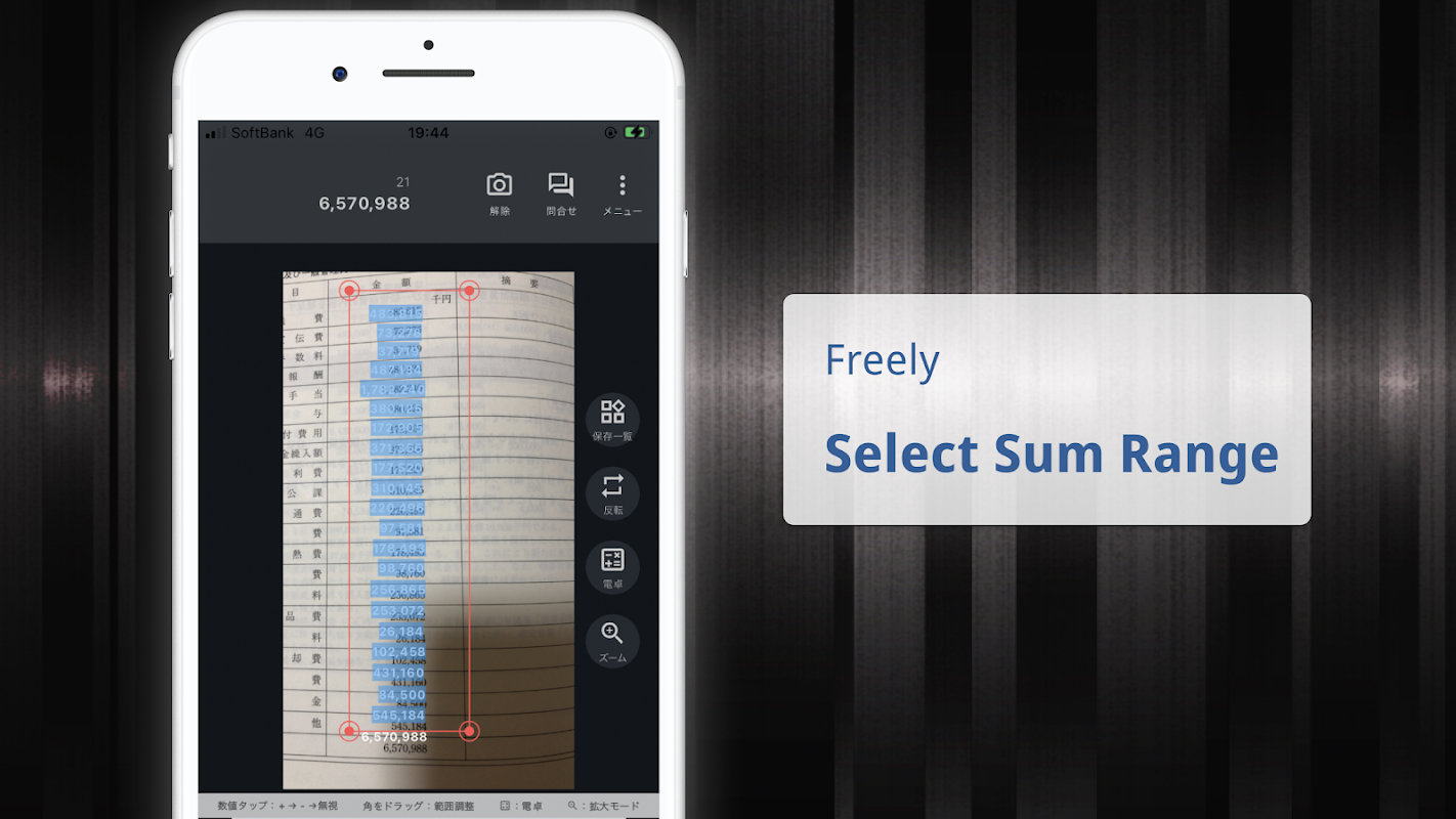Usar este aplicativo é simples e não requer operações ou configurações complicadas. Basta digitalizar um documento usando a câmera do seu smartphone e o aplicativo reconhece imediatamente os valores numéricos e realiza cálculos automaticamente, facilitando o uso por qualquer pessoa.