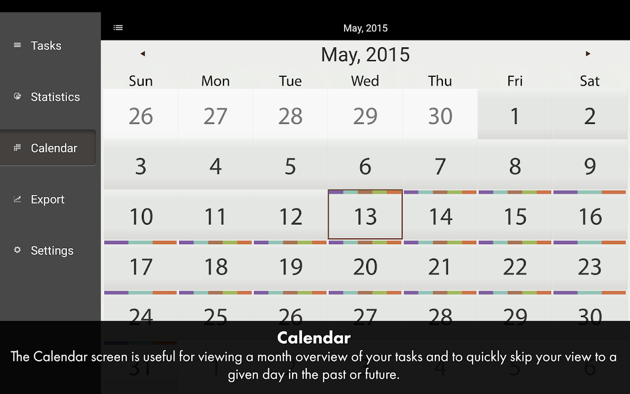 Tasks and full days can be planned in advance & viewed day-by-day via a practical graphic calendar or list view. See category colors mark each day on your calendar with planned tasks.