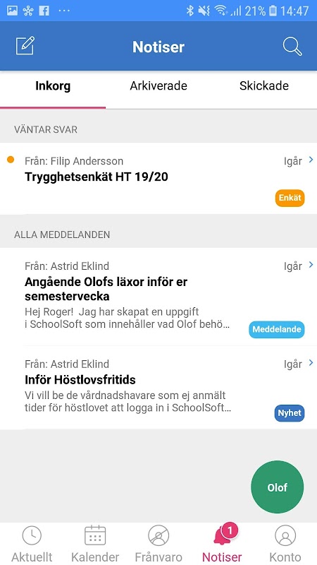 Você obtém acesso rápido a tudo o que há de novo no SchoolSoft e vê claramente o que é lido ou não. Você pode navegar facilmente para sua programação, presença, calendário ou a versão móvel do SchoolSoft.