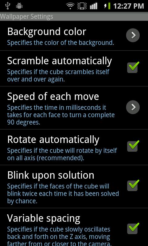 This is a live wallpaper featuring a Rubik's cube self scrambling itself on your home screen! It comes with many different options and settings to play around with. The animations are smooth, the background colors are changeable, the scrambling speed, zoom level, transparency, and a bunch of other stuff can also be tweaked to your liking! You can even make it stop scrambling and just rotate in it's solved state on your home screen. A great wallpaper for puzzle lovers, geeks, or anyone else!