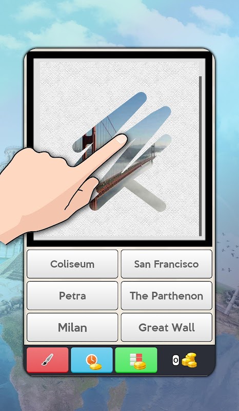 Raspe o Lugar Quiz é um novo jogo Android, onde você tem que arranhar a tela do seu telefone para saber qual é o lugar ou a bandeira que está lá, mas tenha cuidado! Você não pode riscar a tela inteira, apenas uma área pequena, com uma parte da imagem que você arranhar você vai ter que adivinhar o que é! Ah, e se apresse! Você só tem alguns segundos!