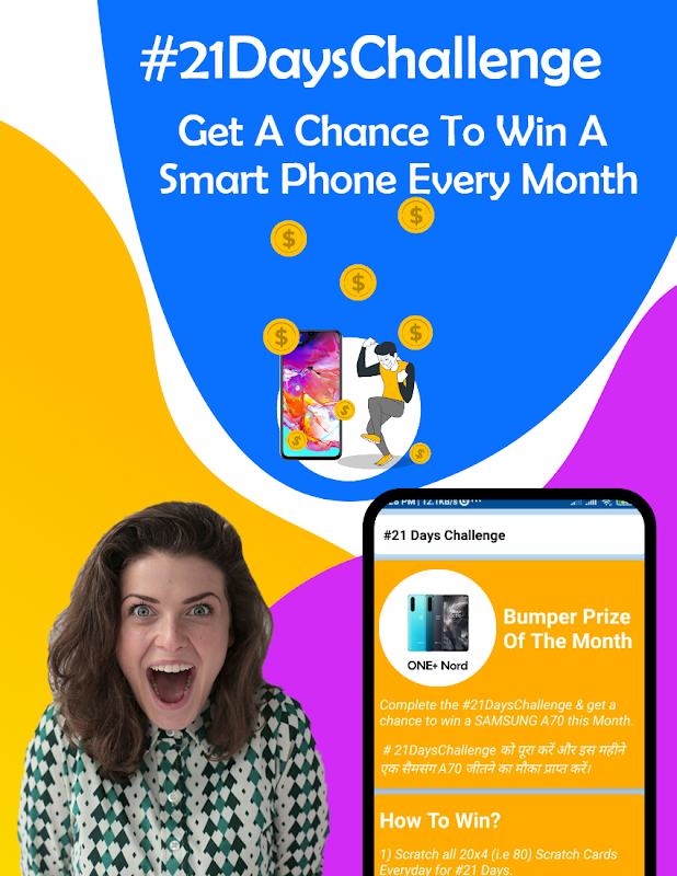 We have introduced the #21Days Challenge. Complete our #21DaysChallenge and get a chance to win one latest smartphone every month. From all the contestants who complete our challenge, one lucky winner will be randomly picked every month, and he/she will be given the BUMPER PRIZE OF THE MONTH. This challenge is absolutely free to participate in. No coins nor any digital currency nor any amount of money is required for taking part. It's Absolutely FREE!!! You Only Have To SCRATCH TO WIN!!!