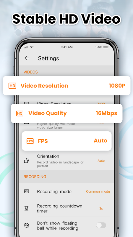* Opções de qualidade: tela de gravação com resolução ajustável (240p a 1080p), qualidade (1 a 16Mbps) e FPS (15FPS a 120FPS).