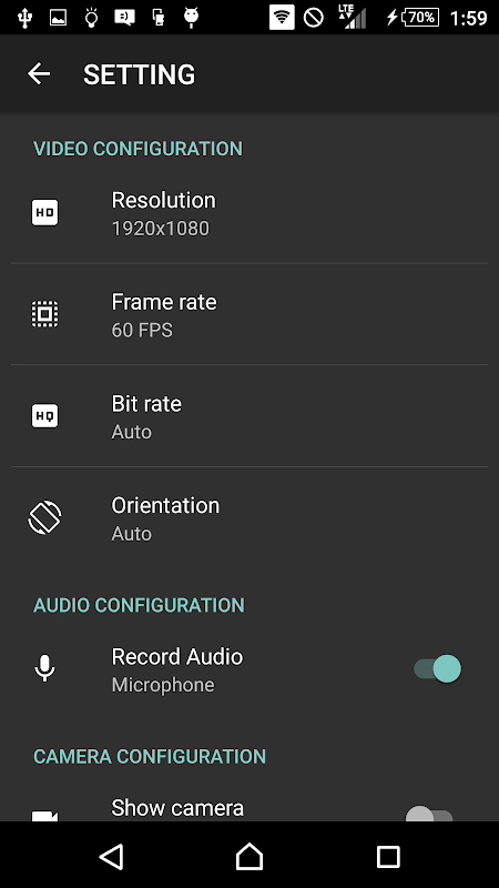 In the settings, you can change the Video Resolution, Frame rate, Bit Rate and Orientation.