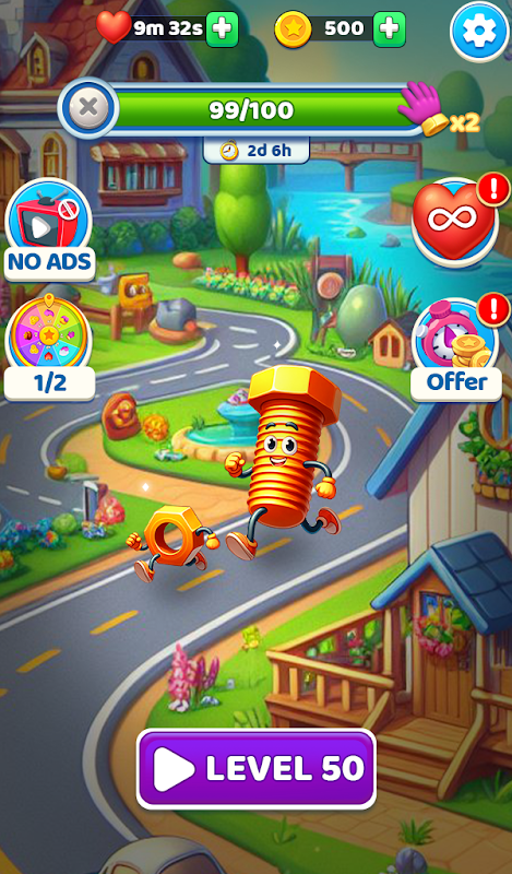 - 3 peças de parafuso iguais serão removidas do tabuleiro quando combinadas.