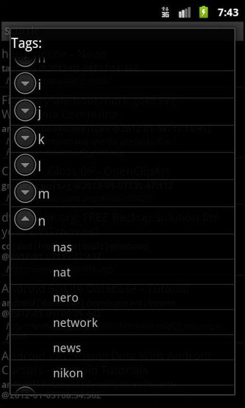 Você pode navegar pelos seus marcadores armazenados, filtrá-los por tags (adicionar mais para se cruzam, toque no topo da lista para redefinir filtro), busca-los e adicionar novo a partir do navegador via "Share".