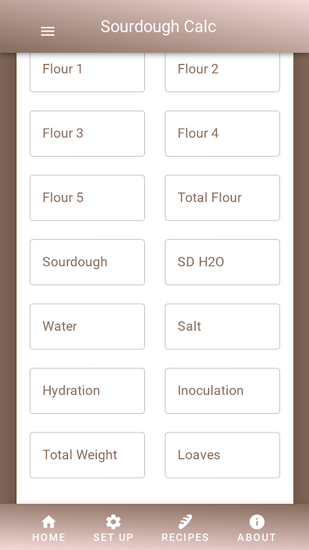 A tela básica mostra a calculadora, onde você insere quantidades em gramas, calcula porcentagens vitais e salva como receitas. Depois de inserir as quantidades das várias farinhas, fermento, porcentagem de hidratação do fermento e água, todo o resto é calculado. Altere os valores para ajustar seus parâmetros. Ao pressionar o botão Salvar, as porcentagens são salvas. Você pode adicionar um título, adicionar ou modificar seus ingredientes e algumas notas adicionais sobre como fazer e assar sua receita e, em seguida, Salvar.