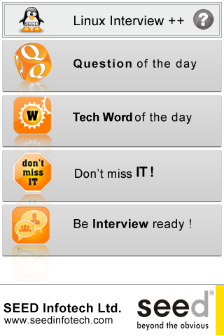 SEED IMS LinuxInterview++ app aims at equipping you for job interviews with latest information in the form of daily technical knowledge tablets. It consists of question of the day, technical word of the day and news of the day. All of these to keep you updated about relevant happenings about Information Technology industry. All this is important and asked in the interview.