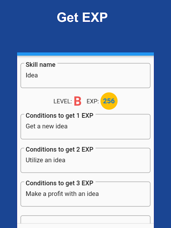 Avalie suas habilidades e defina níveis. Ao atingir as condições necessárias para o aprimoramento de habilidades, você pode ganhar pontos de experiência e subir de nível. Você pode personalizar as condições de subida de nível. As habilidades preparadas desde o início são principalmente habilidades de negócios, mas você também pode adicionar habilidades de acordo com seus hobbies como habilidades originais.