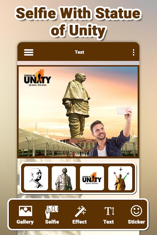 This app provides you the different Statue of Unity images you can set them as in your Statue of Unity photo frame. You can choose your best from your phone gallery or you can take live photo and then add Statue of Unity in selfie frame.