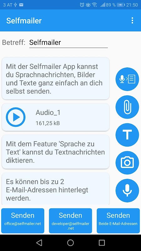 Mit der Selfmailer App kannst du Notizen, Memos, Sprachnachrichten und Bilder an dich selbst senden.