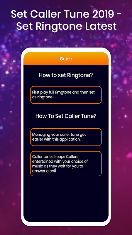 Set Caller Tune 2019 - Set Ringtone Latest app also provide users to instruction with which it's easy to use by anyone. Now it's easy to set the latest caller tune with your choice from application caller tune collection. Just simple to set ringtone or caller tune with your way. The application also allows setting notification tone. This is the grate application with which your caller tune or ringtone will be different from anyone.
