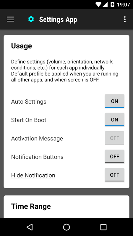 Aplicativos diferentes precisam de configurações e configurações diferentes. Este aplicativo ajuda você a alternar para diferentes conjuntos de configurações para cada um de seus aplicativos individualmente. Ele inclui volume, orientação, condições de rede, conexão Bluetooth, brilho da tela, manter a tela acordada, etc. (não precisa root !!!)