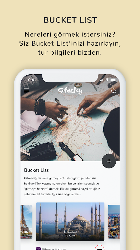 Com a guia "Lista de itens", os membros podem preparar suas próprias listas de viagens para as cidades que sonham acessar seturday.com.
