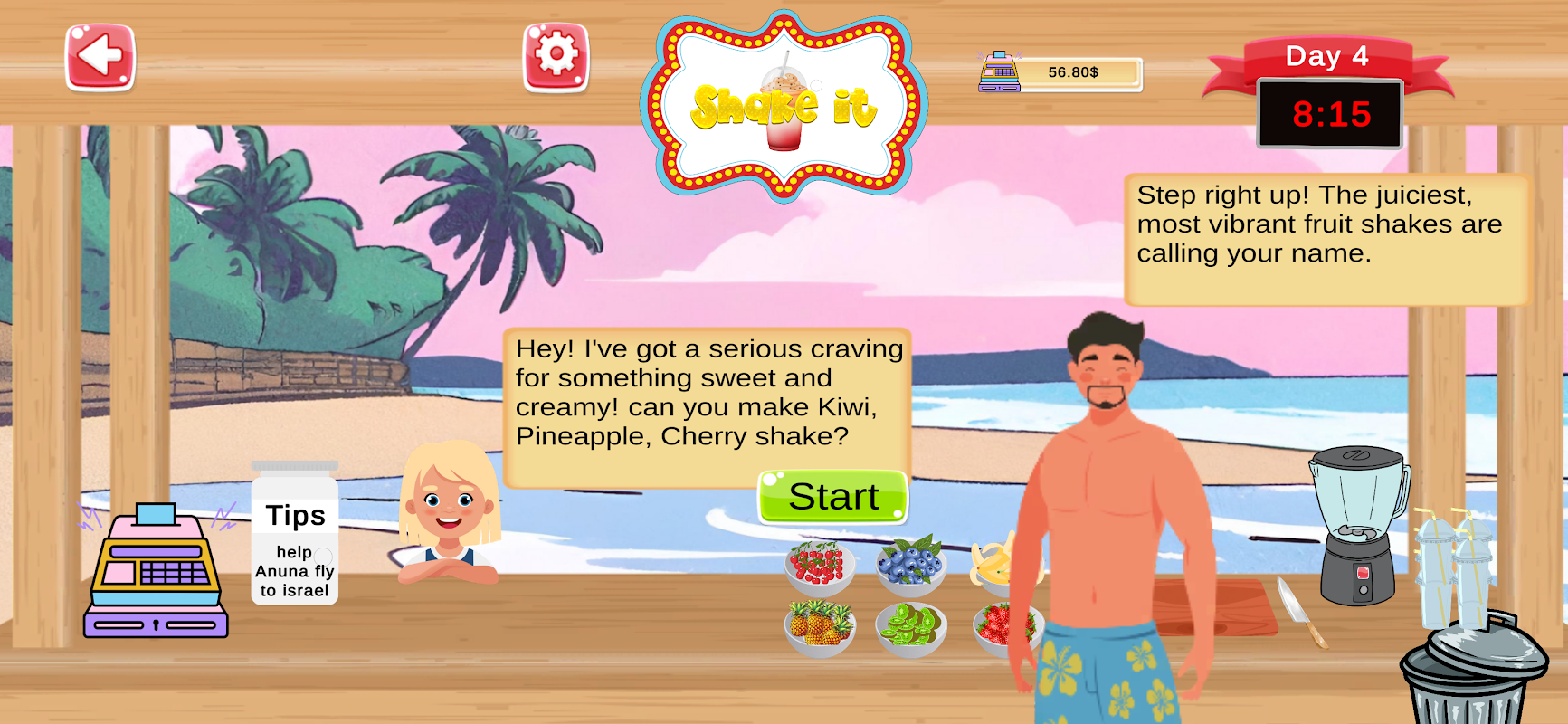 Embarque em uma aventura frutada com o Shake It! Mergulhe no mundo agitado de administrar sua própria barraca de shake de frutas, onde cada dia é preenchido com cores vibrantes e sabores deliciosos. A partir do momento em que o estande abre às 08h até fechar às 22h, os clientes se reúnem para satisfazer seus desejos por refrescantes shakes de frutas.