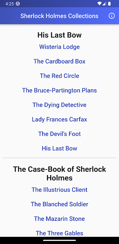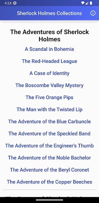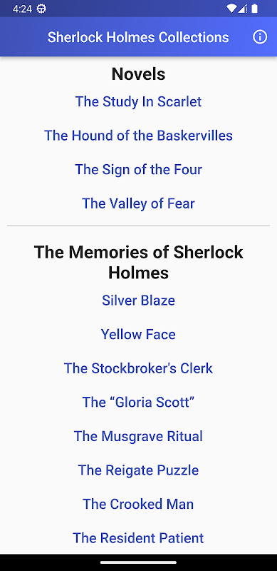 Este aplicativo contém uma coleção completa de romances de Sherlock Holmes de acordo com as seguintes categorias.