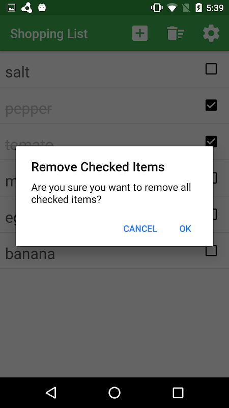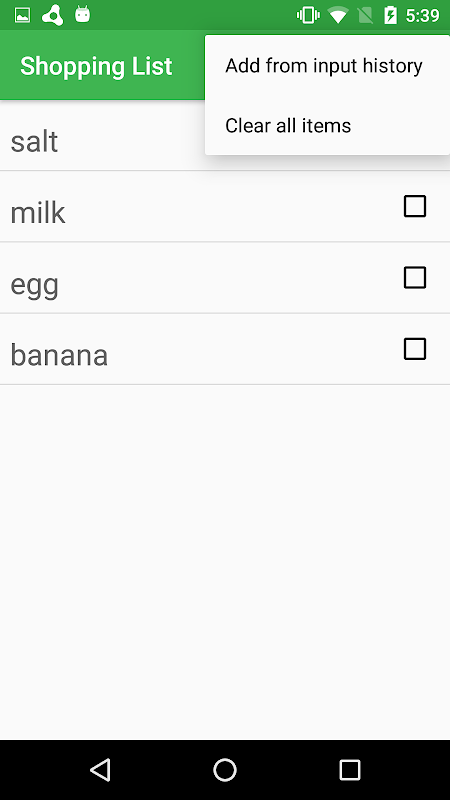 Adicionar o nome de itens que você deseja comprar. Depois de colocar o item no seu carrinho de compras, marque o item e excluir da lista. Toque lixo botão lata no topo da tela para remover itens verificados.