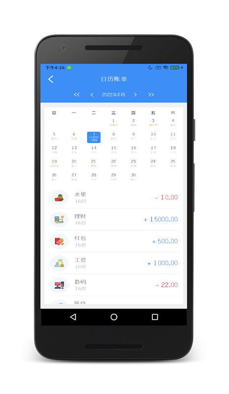 4. Estatísticas do calendário, você pode ver rapidamente suas receitas e despesas diárias