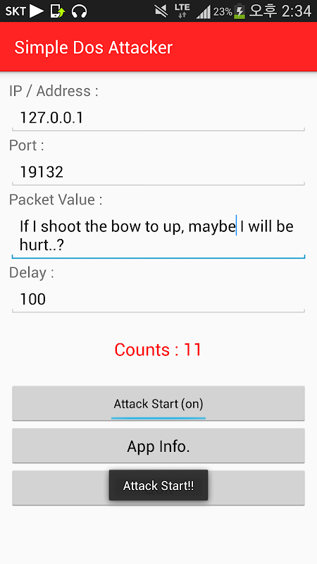 IP 또는 도메인과 포트, 전송할 패킷의 내용과 딜레이를 입력하고, "Attack Start"을 누르면 해당 도메인으로 패킷이 신나게 전송됩니다.