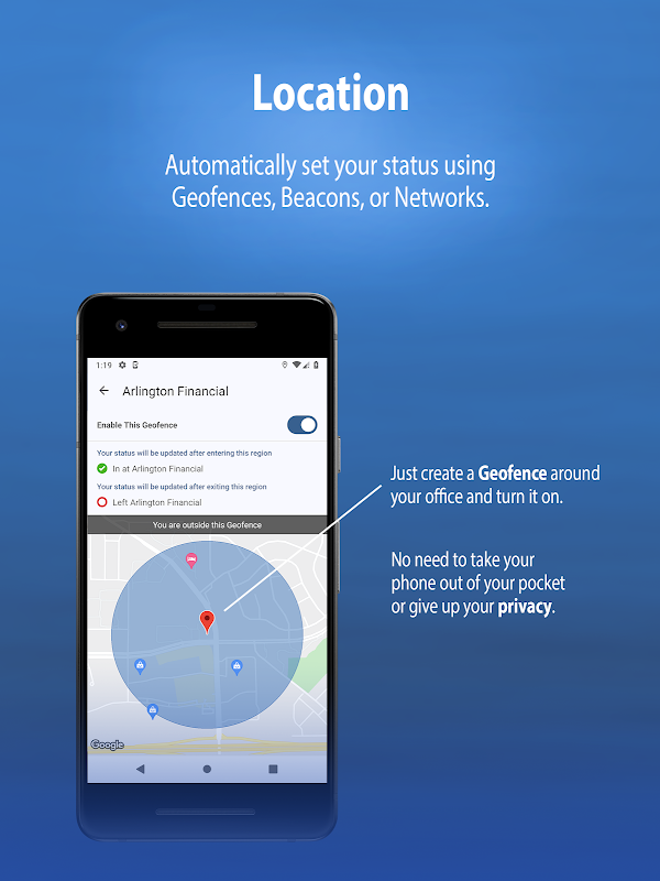 O Simple In/Out é o painel de entrada/saída mais fácil de usar da Play Store. É ótimo para escritórios com pessoas sempre em movimento. Nossa interface fácil de usar permite que você defina seu status rapidamente e volte ao trabalho. Você também pode configurar seu telefone para atualizar seu status automaticamente com base na localização do seu dispositivo.