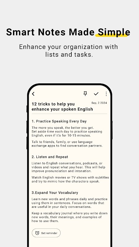 📌 Recurso de pós-chamada : o Simple Notepad exibe um aviso durante a chamada que permite aos usuários identificar chamadas recebidas em tempo real. Se o nome do chamador estiver salvo nos contatos do telefone, ele aparecerá; caso contrário, o número desconhecido será exibido. Os usuários podem então criar notas e listas de verificação personalizadas logo após a chamada, ajudando-os a lembrar facilmente detalhes importantes relacionados à conversa ou ao chamador.