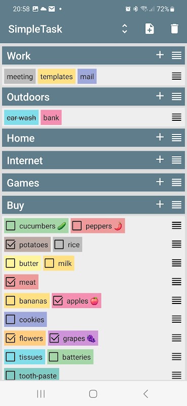 Um aplicativo simples e prático para gerenciar listas de tarefas, notas, listas de compras, listas de desejos, etc. De forma muito rápida e fácil, você insere uma nova tarefa (nota), define sua cor e possivelmente outras propriedades e coloca-a em uma lista adequada (página). Você pode facilmente excluir uma tarefa ou movê-la para outro lugar na lista ou para outra página com apenas um toque. Todas as listas de tarefas são exibidas claramente em uma tela com expansíveis opcionais. Você pode ter uma prévia das tarefas na tela inicial na forma de um widget.