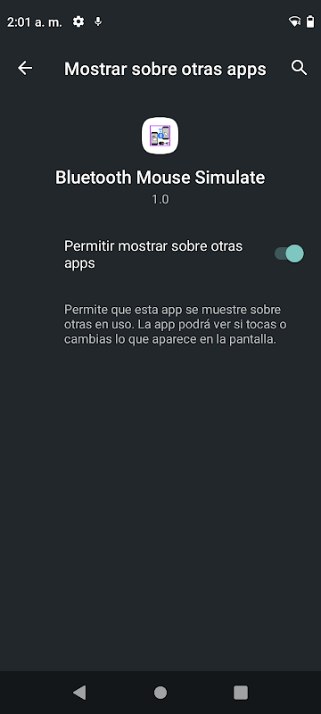 Caso o usuário concorde em utilizar este recurso AccessibilityService , o aplicativo terá a capacidade de simular o ponteiro do mouse na tela e aguardar comandos Bluetooth para mover o cursor. Caso contrário, se o usuário rejeitar o uso desta função, ela não poderá ser usada como dispositivo receptor, mas poderá ser usada como dispositivo de controle.