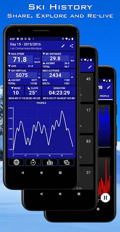 Acompanhe métricas essenciais de esqui e snowboarding, como velocidade, altitude, distância e outros dados úteis para analisar cada descida.