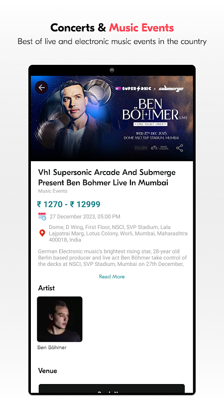 * Parcerias exclusivas entre locais e artistas: Unimos forças com locais, artistas e bandas internacionais renomados para oferecer a você os eventos ao vivo mais emocionantes da Índia.