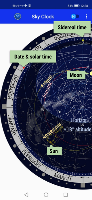 Este é um aplicativo de relógio com planisfério para Android. O planisfério mostra o céu atual no local de observação definindo a latitude e a longitude. Você pode alternar os hemisférios celestes norte e sul. O nome do aplicativo foi alterado em abril de 2023.