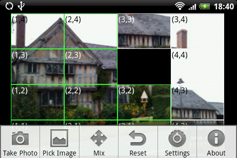 Android™ version of the classic sliding 15 puzzle game. Take a photo or pick an existing image, mix it up and solve it at your leisure.