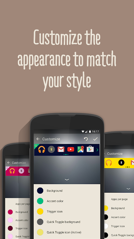 Get quick access to your apps, shortcuts and quick-toggles just when you need them. Create multiple scenarios by using different trigger which will ensure that your apps are only available when needed.