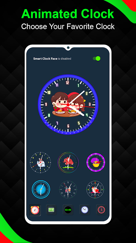 O Relógio Inteligente & amp; O Relógio Animado é um relógio digital que possui um display LED brilhante e uma tela iluminada. O aplicativo tem um design de economia de bateria. O Relógio Digital & amp; O Relógio Animado também possui uma luz noturna embutida com uma função que liga e desliga automaticamente. O Relógio Inteligente & amp; Relógio animado é perfeito para todos os usuários móveis.