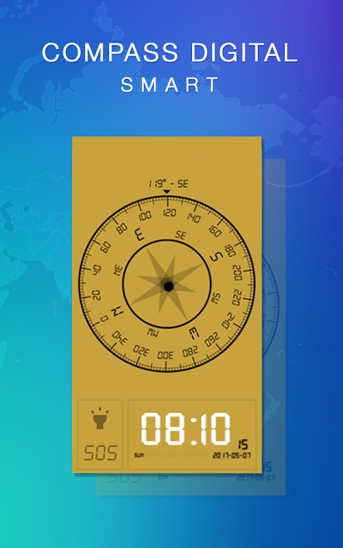 Flashlights and digital clocks are located just below the smart compass. A really beautiful digital clock with hours , minutes, seconds, week and date with style digital. Smart Compasshas beautiful, pure and practical UI design. Digital Compass has a flashlight, you use it when you walk in night. It has a SOS function, you can use it on your outdoor activity.