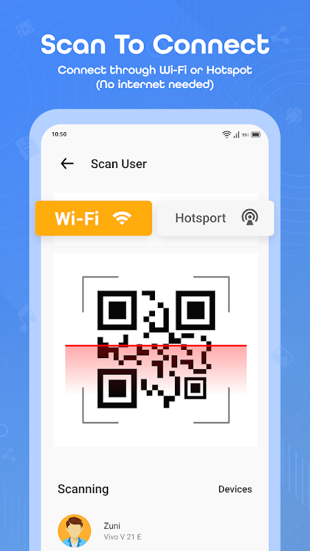 Com o aplicativo Phone clone, você pode compartilhar arquivos ou transferir dados entre dois telefones usando Wi-Fi sem usar nenhum dado.