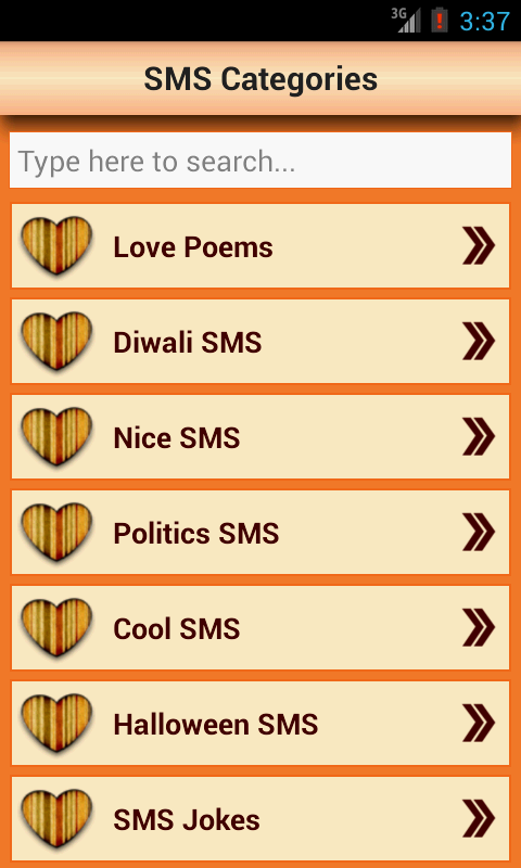 - Cerca de 50 + categorias de coleta de sms, como amizade, amor triste, romance, piadas engraçadas, aniversário, shayari, desejos manhã, boa noite sms.