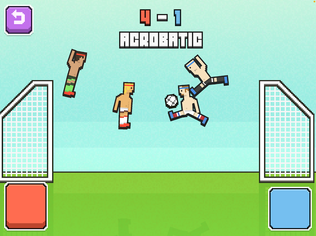 Toque no botão para pular e chutar. Você controla seus dois jogadores de futebol com apenas um botão. Chute a bola no gol do seu oponente para marcar.