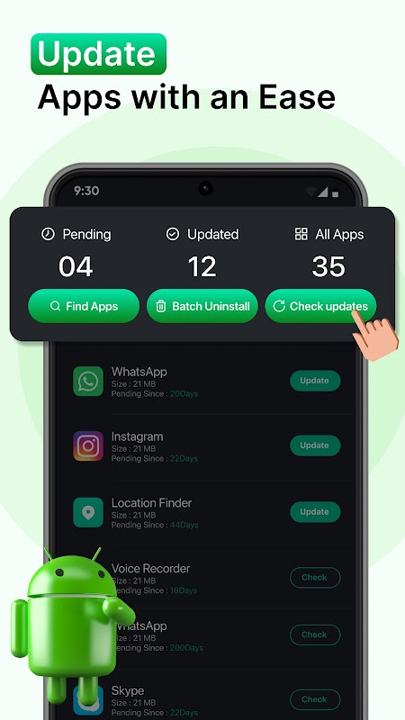 A ferramenta de atualização de software garante que todos os aplicativos do seu telefone — desde os principais aplicativos do sistema até os aplicativos baixados — estejam sempre executando a versão mais recente. O aplicativo permite que você encontre atualizações rapidamente com um único clique, seja uma atualização do WhatsApp ou um patch de segurança essencial.