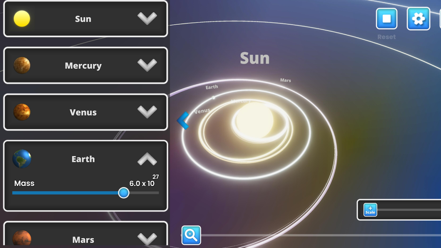 Neste aplicativo, você pode alterar a massa de qualquer planeta, para observar como a variação na massa de um planeta afetará o movimento de outros planetas e como as órbitas dos planetas mudam.