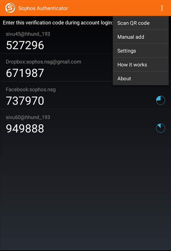 Depois de configurada, a autenticação em duas etapas protege sua conta, exigindo sua senha e um código adicional, adicionando assim uma camada extra de segurança. O aplicativo irá gerar esses códigos para você de forma cómoda, diretamente no seu smartphone ou tablet, sem a necessidade de conexão à Internet. O Sophos Authenticator não opera apenas com uma conta Sophos, mas também com contas do Google, Dropbox, Facebook, Github e todos os outros fornecedores que implementam a autenticação desta forma padronizada.