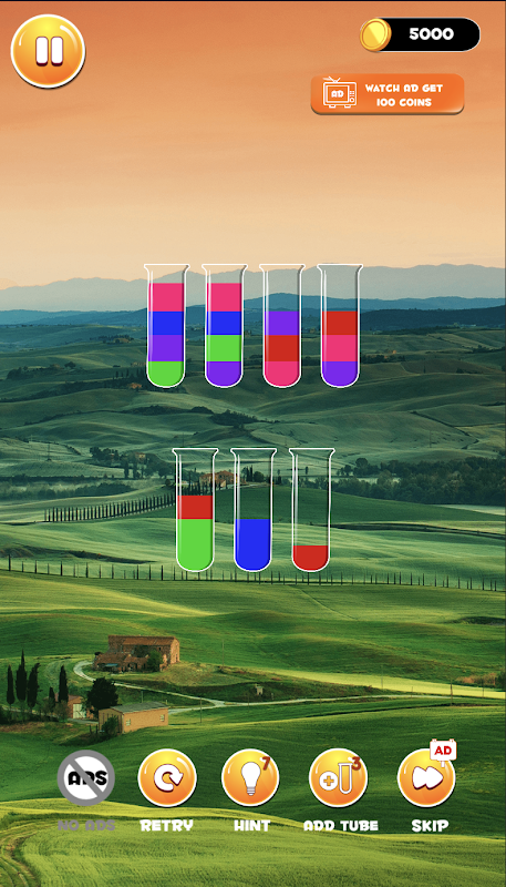 O principal objetivo do jogo Sorting Watercolor sort é classificar a água por cor e despejar líquidos da mesma cor em um tubo.
