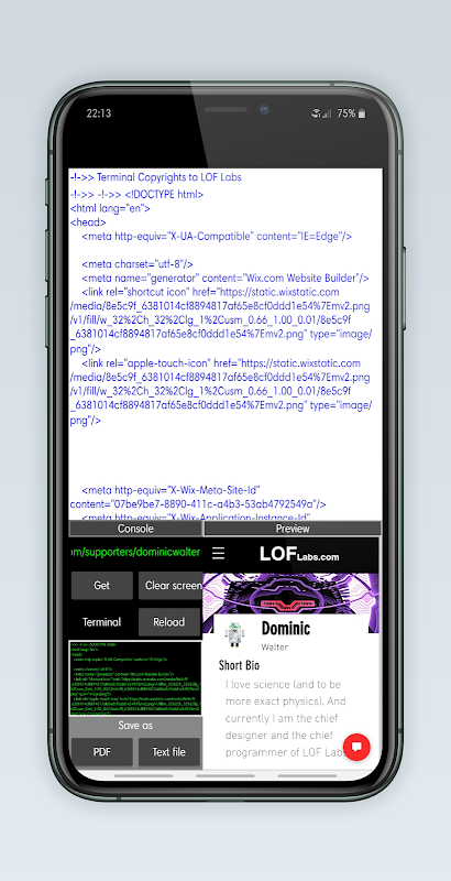 Esta aplicação permite-lhe visualizar o código-fonte de qualquer site existente, basta digitar o URL.App criado por Dominic Walter para LOF Labs