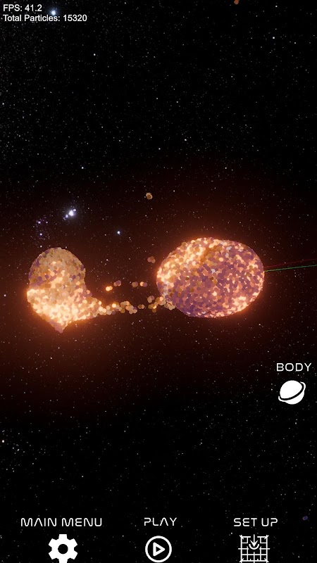 A simulação permite que você avance diretamente para colisões de alta energia ou personalize as condições iniciais no Modo de Configuração. Ajuste parâmetros como contagem de partículas, velocidade do planeta e precisão da colisão para criar seus próprios cenários de colisão.