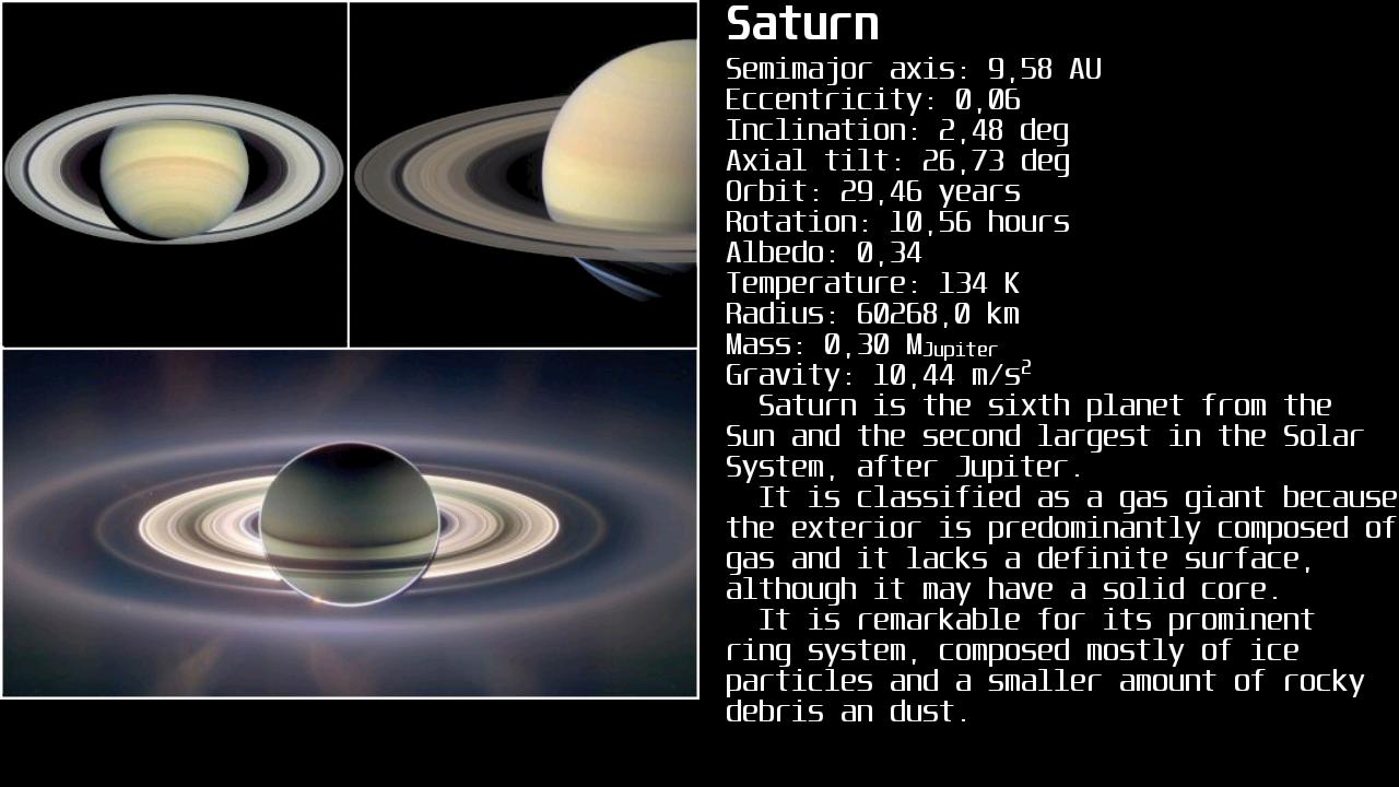 * Saturno e suas luas principais: Mimas, Encélado, Tétis, Dione, Reia, Titã, Hiperião e Jápeto