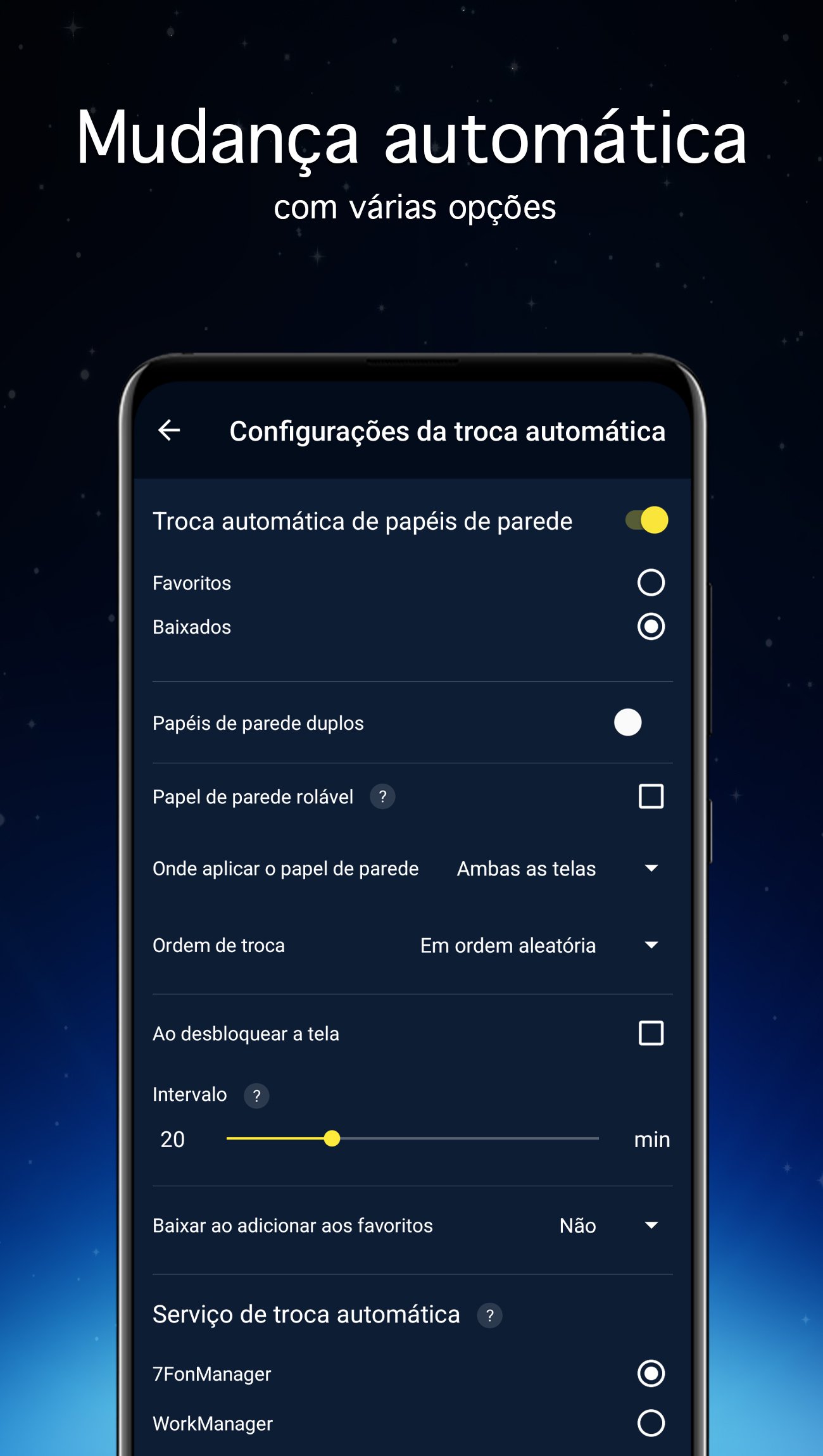 Escolha a origem (uma categoria ou seus favoritos) e defina o intervalo. Você pode configurar papéis diferentes para a tela inicial e para a tela de bloqueio, deixando o visual sempre renovado.