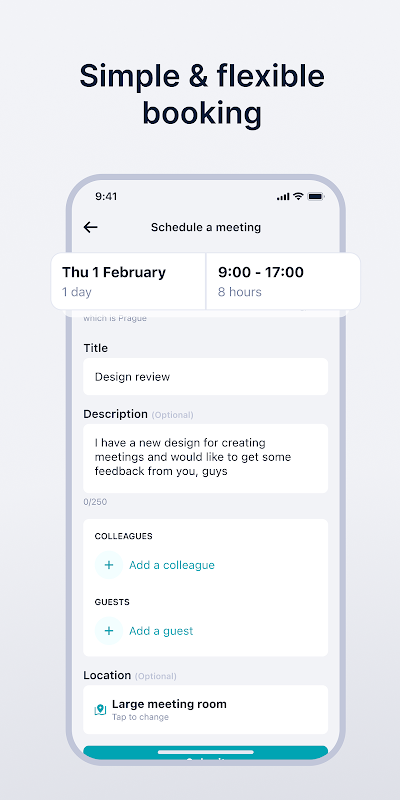 - Encontre e reserve rapidamente uma sala adequada para a sua reunião