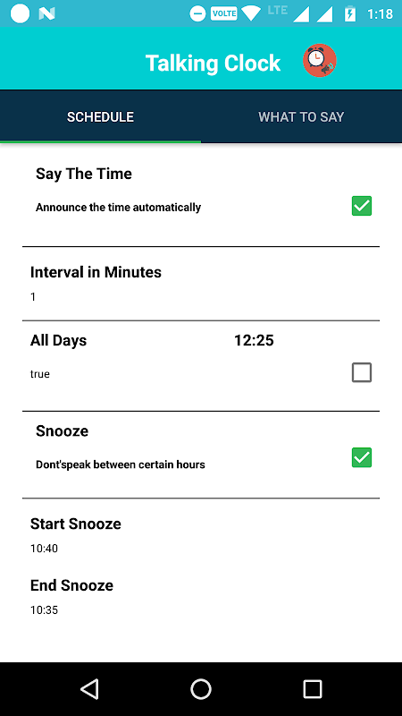 1.Enjoy automatic time announcements at regular intervals. Say the Time can tell you the time every minute, 5 minutes, 10 minutes, 15 minutes, 20 minutes, half hour, or hour. 2.Set a snooze period to turn off time announcements between specific hours. That way you won't be bothered when you're asleep! 3.Customize the spoken announcement. Hear the time in 12 hour, 24 hour. 4.Set the particular week days to say the clock. 5.Set your preface to speak text of the clock 6.Shake to tell the current system time. 7.set your volume for speaking text 8.You will get the Notification for the say the time is in ON and also if you want stop the speaking you will stop the notification bar. 9.for shortcut we developed the widget for this app.